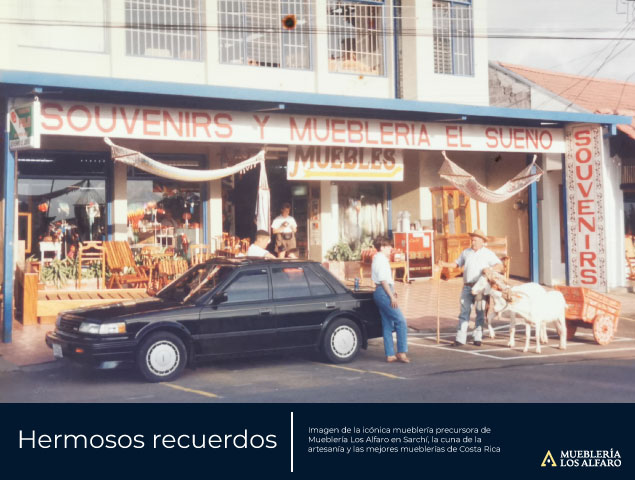 A mediados de la década de los años 70, tuvo lugar un evento trascendental en la vida del Sr. Asdrúbal Alfaro Salazar. En ese tiempo, movido por su visión emprendedora y perspicacia, decidió dar vida a una empresa familiar que llevaría por nombre Mueblería y Souvenirs El Sueño. Con gran determinación, el Sr. Alfaro Salazar identificó valiosas oportunidades de empleo y se propuso crear un espacio propicio para explorar y desarrollar el innegable talento que los sarchiseños poseen en la fabricación de carretas típicas, souvenirs y una amplia variedad de muebles. Así, con su dedicación y esfuerzo, este visionario hombre dio inicio a una empresa que hoy en día sigue dejando su huella en el mundo del diseño y la artesanía.